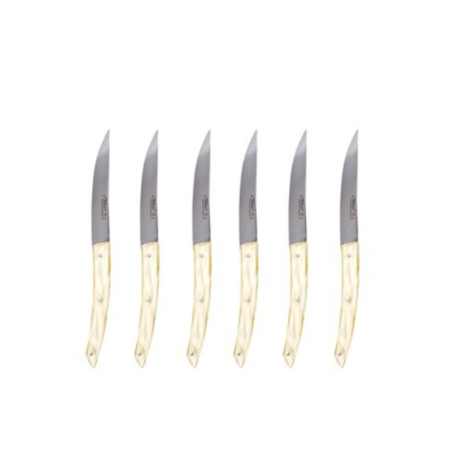 Le coffret de 6 couteaux à steak Le Thiers manche nacrine séduit par sa forme élancée au style moderne. Beaucoup de qualité pour ces couteaux au manche nacrine de couleur noire ou crème. Leur tranchant est net par la lame fine et régulière sur les deux faces. Leur réaffutage est ainsi aisé. La coutellerie français est ainsi bien représentée. Ses artisans au savoir-faire inégalé le montre par ce produit. Fabrication 100% française à Thiers capitale de la coutellerie.