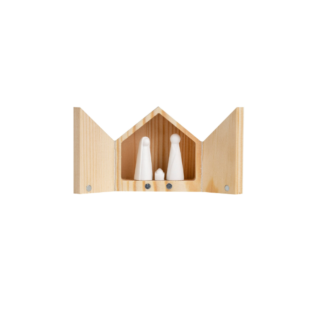 Tout simplement ravissante : cette mini crèche séduit par la forme dépouillée de ses personnages, Jésus, Marie et Joseph. Le coffret en bois qui se referme par ses portes aimantée représente leur grotte. Fermée, elle suscite de la curiosité, ouverte elle nous comble. Magie de Noël.